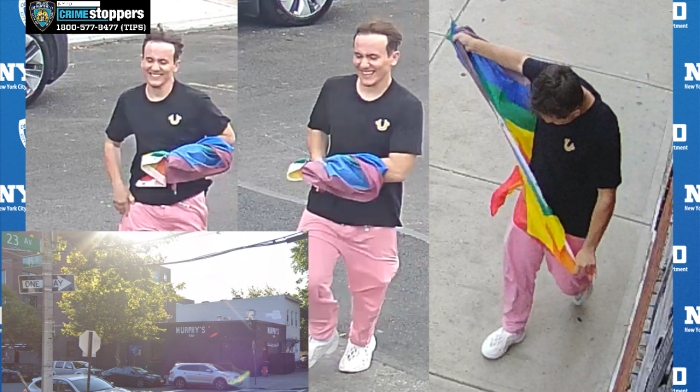 The NYPD’s Hate Crimes Task Unit has joined the search for a vandal who allegedly tore down a Pride flag at a popular Astoria sports bar and was caught on camera pulling out a knife and slicing it to pieces as he and a friend walked up 23rd Avenue.
