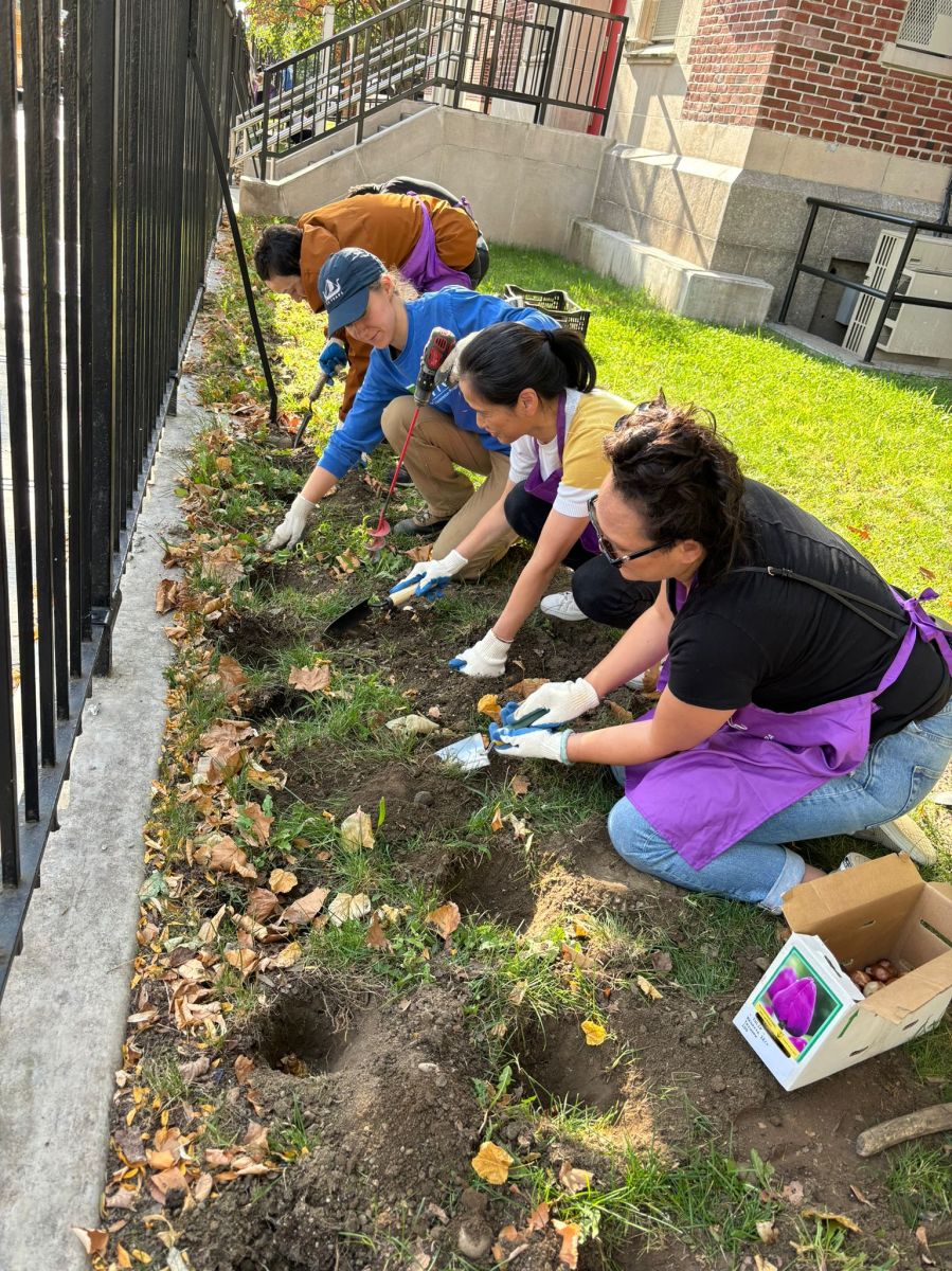 Volunteers from the PS 102Q Parent Association plant bulbs for school spirit. Photo by PS102QPA.