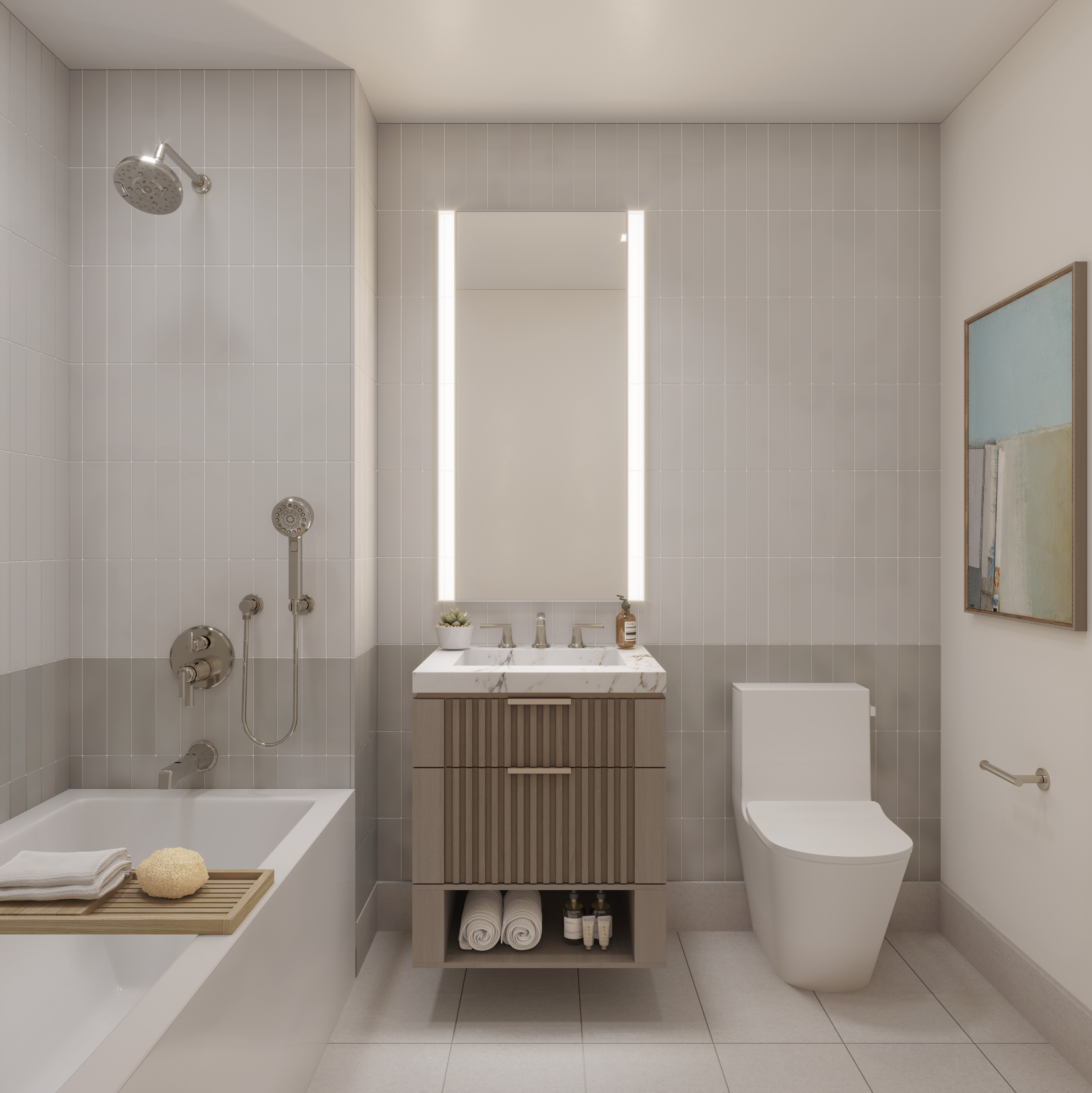 A typical bathroom within a Centric unit. Rendering by Redundant Pixel, LLC.