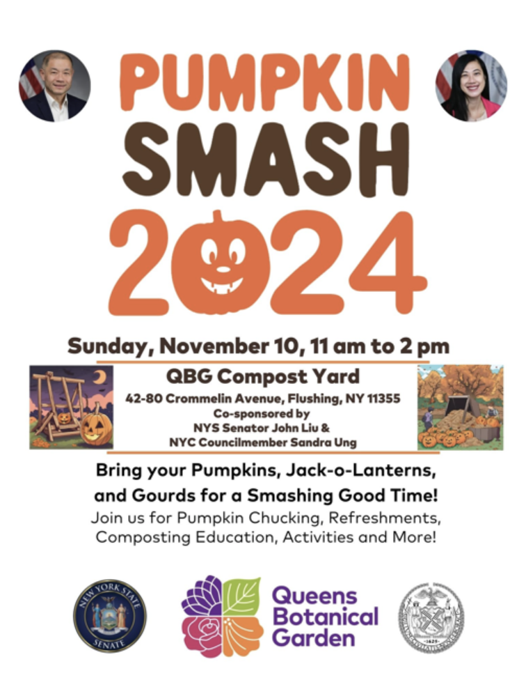 On Friday, State Senator John Liu and Council Member Sandra Ung announced that this year’s Pumpkin Smash will be in partnership with the Queens Botanical Garden (QBG) in Flushing. The event will take place on Sunday, Nov. 10, from 11 a.m. to 2 p.m.