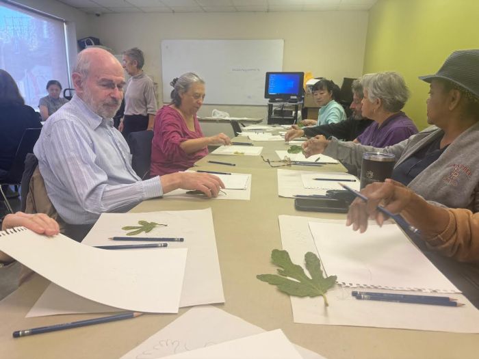 Karen Fitzgerald then led the group in contour drawing, where she taught attendees how to draw different types of leaves. The added challenge was looking only at the leaf and not down at their paper and moving the pencil across the page using different amounts of pressure to create dark and light areas.