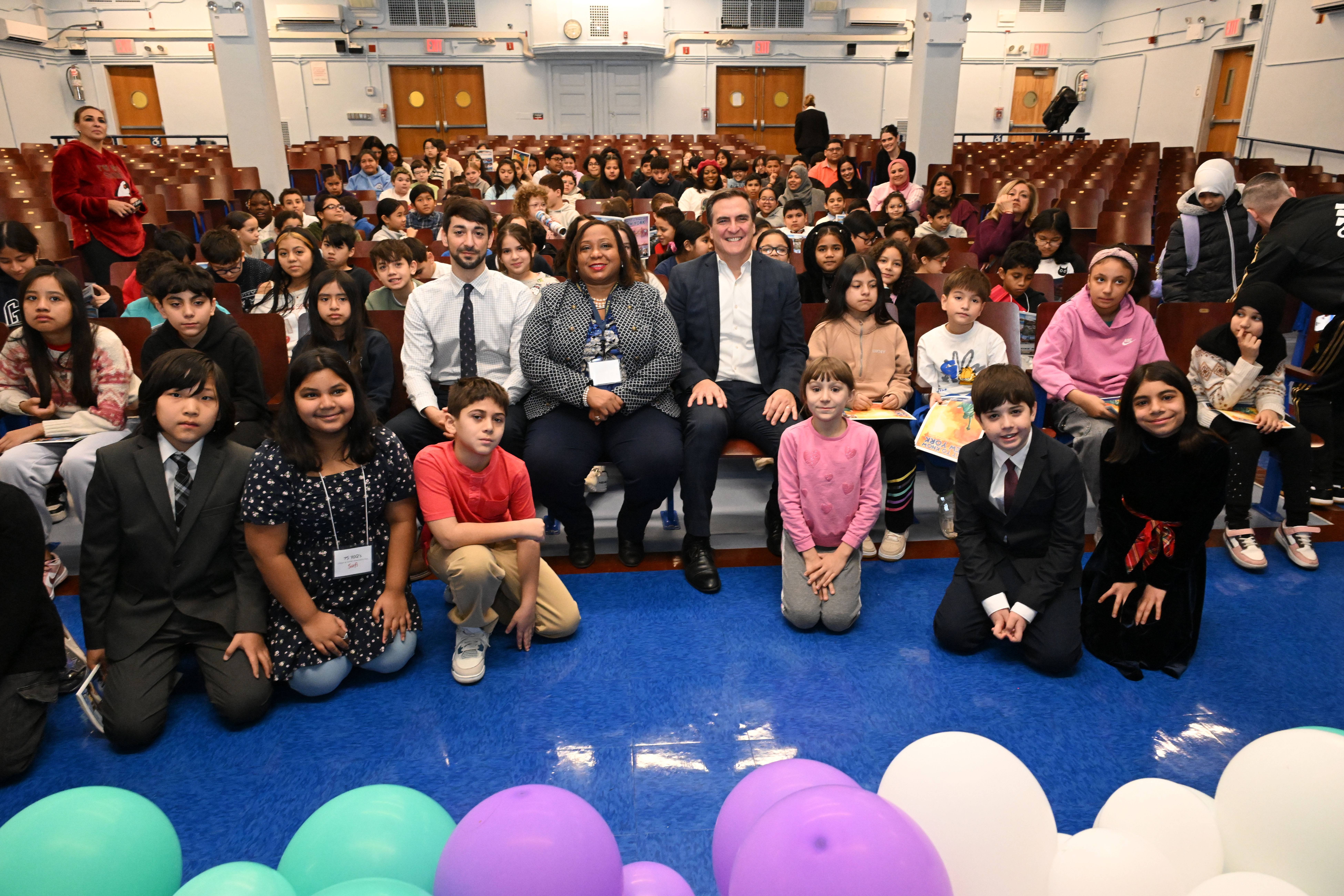 State Senator Michael Gianaris with students and staff from P.S. 70Q. Photo by Ramy Mahmoud