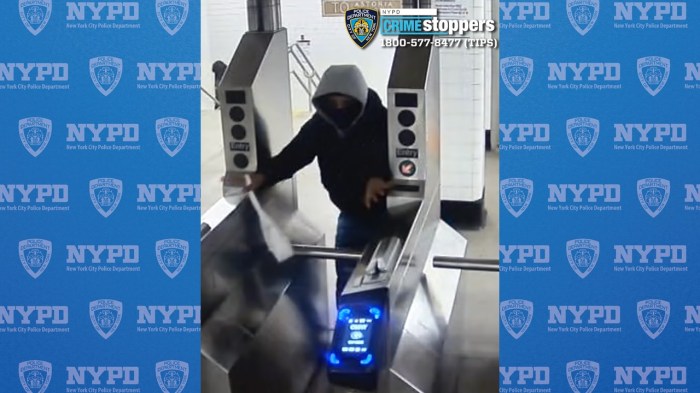 The NYPD released a surveillance image of the suspect as he jumped a turnstile at the station. He wore a black face covering, a black winter jacket over a gray hooded sweatshirt and dark pants.