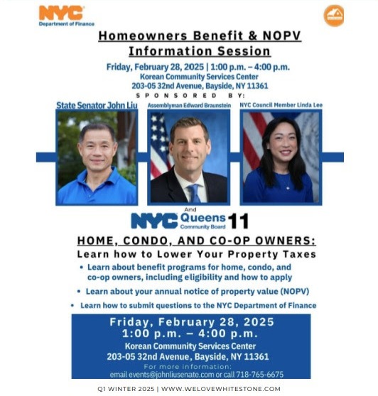 Council Members John Liu and Linda Lee, along with Assembly Member Ed Braunstein, will host a Homeowners Benefit and Notice of Property Value information session on Friday, Feb. 28, from 1 to 4 p.m. at the Korean Community Services Center in Bayside, located at 203-05 32nd Ave.