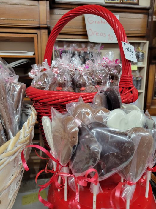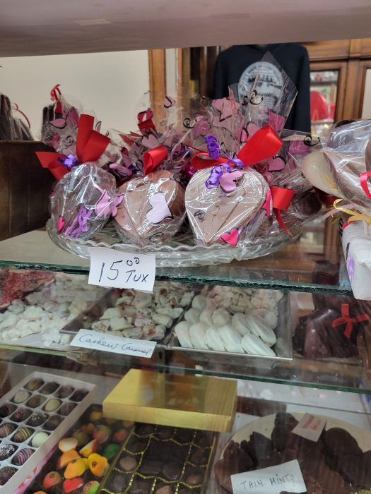 The prices at the shop have a range for all budgets- there are chocolate heart-shaped lollipops, a pretty box with a mix of cookies and chocolates, and of course, there are fancier items, which Schmidt even puts a sign in front of the display, reading “fancy,” to let customers know. Even their chocolate heart boxes range from simple to fancier, though Schmidt doesn’t push the item on customers. With rising prices and inflation, the cost of a special box and wrapping paper could get costly, so they even help customers by suggesting they don’t really need a fancy box for the chocolates if they don’t want it.