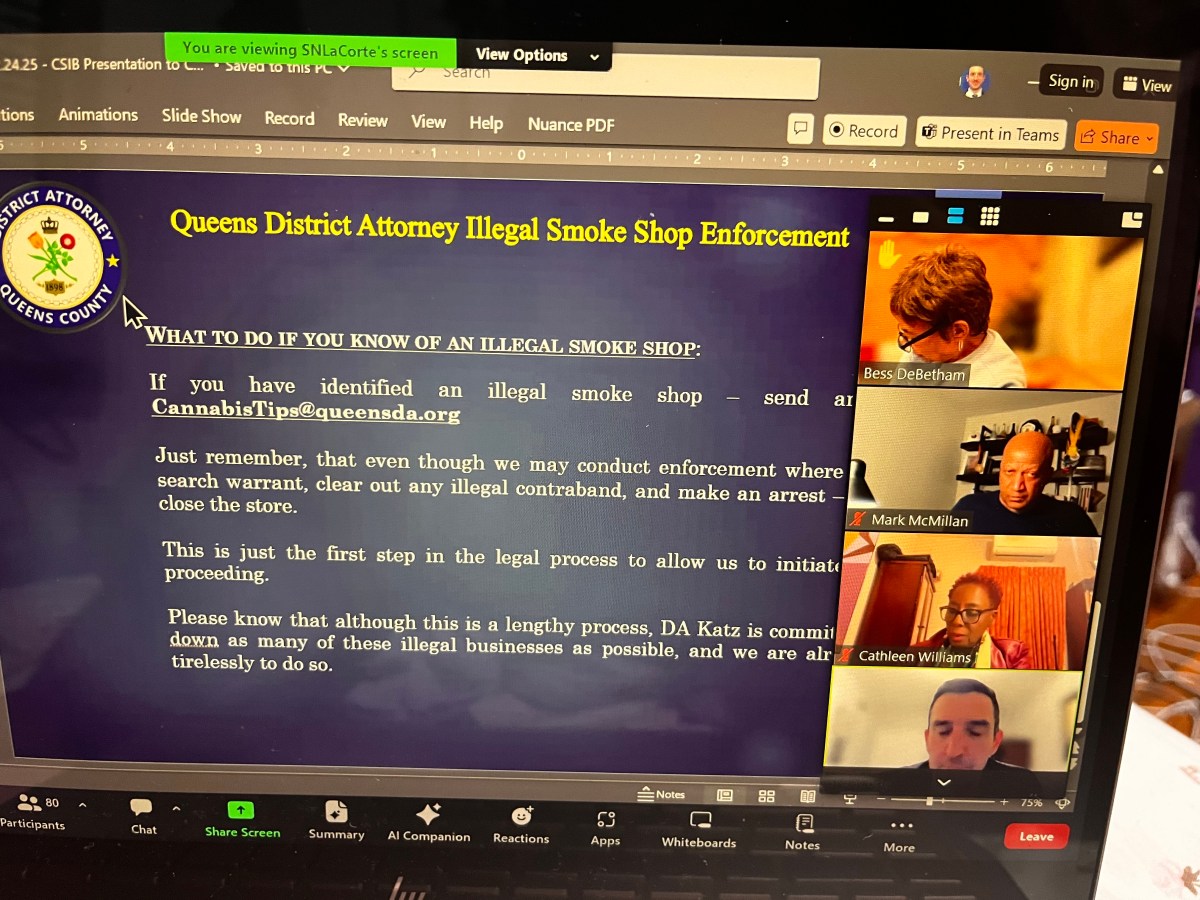 Shanon LaCorte Esq., the bureau chief of crime strategies & intelligence bureau at the Queens District Attorney’s office, gave an in-depth presentation about cannabis enforcement during the CB13 meeting in February.
