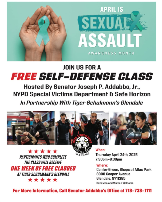 On Thursday, April 24, Addabbo will host a free interactive self-defense training class as part of his efforts to promote Sexual Assault Awareness Month. The event will take place from 7:30 p.m. to 8:30 p.m. at the Shops at Atlas Park (on the Center Green), located at 8000 Cooper Ave. in Glendale.