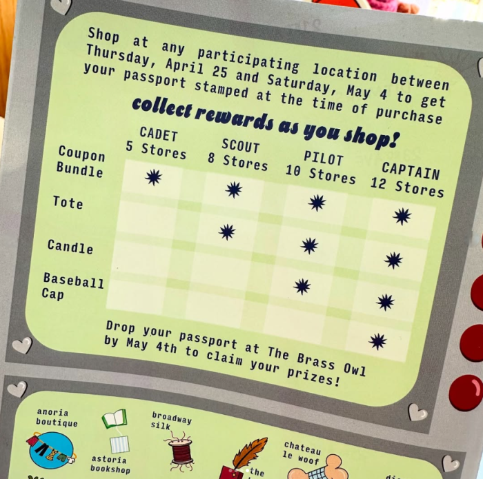 Shoppers are encouraged to turn in their completed passports to the Brass Owl, located at 36-19 Ditmars Blvd., by Friday, May 9 in order to receive their prizes.
