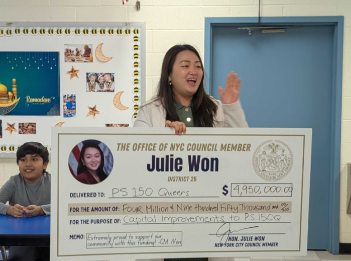 Council Member Julie Won recently presented a check for almost $5M to PS 150. Photo from the office of CM Won