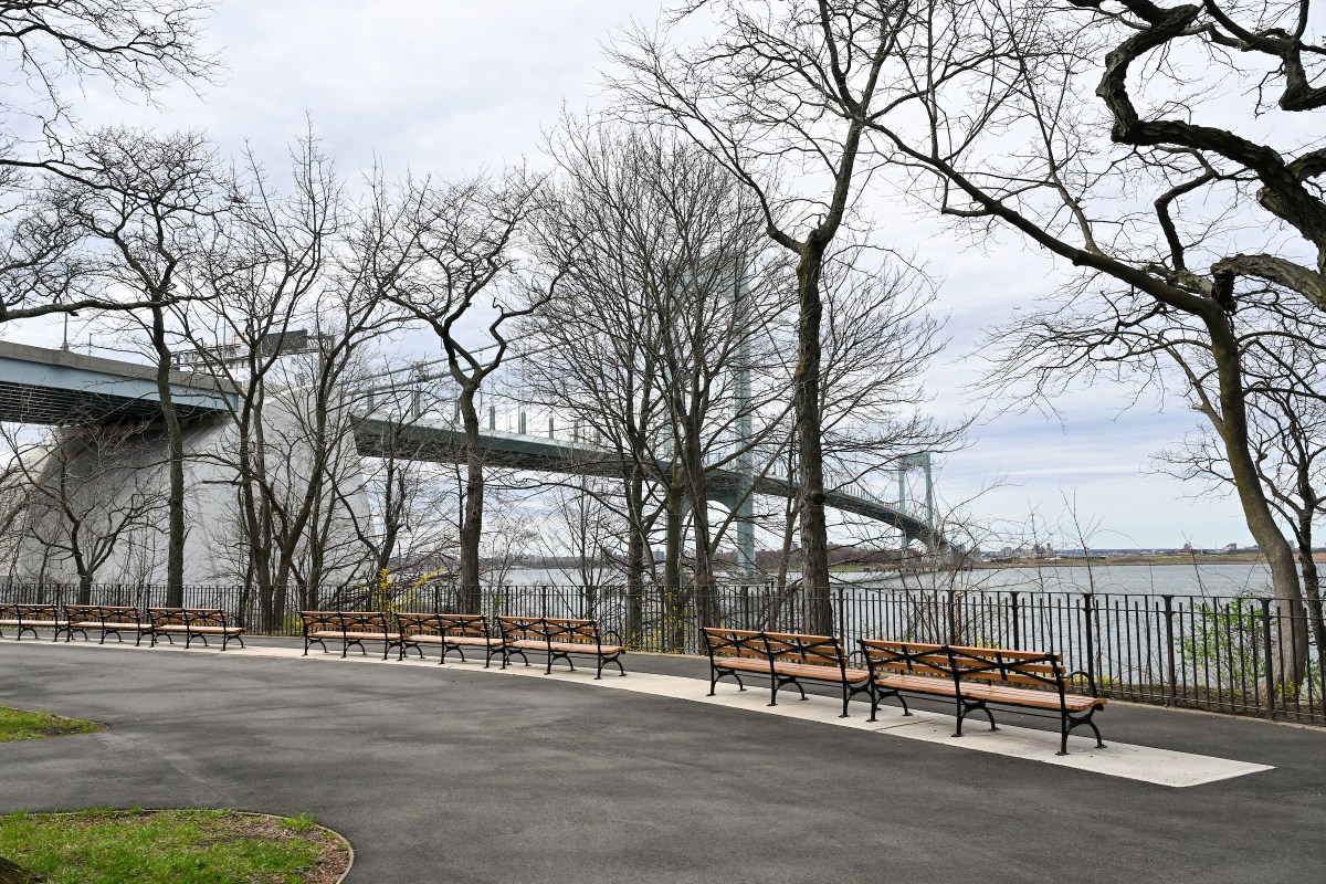 The reconstruction included the installation of bluestone pavement, new benches, game tables with chairs, and the complete restoration of the flagpole, which now features a granite-clad base. A newly reconstructed asphalt pathway connects the plazas and is lined with additional seating overlooking the East River and Whitestone Bridge.
