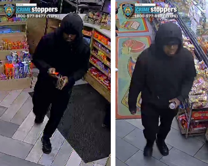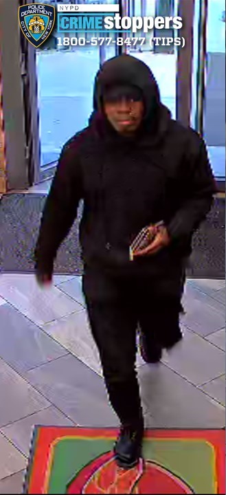The NYPD released surveillance images of the suspect in a nearby convenience store and described him as having a medium complexion. He wore a black hooded winter jacket over a black baseball cap, black pants, and black boots.