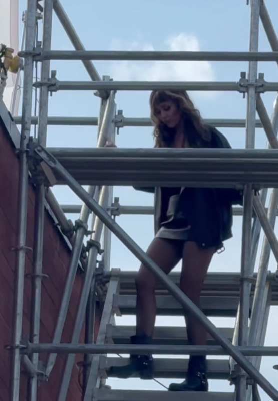 The Grammy Award-winning artist performed a series of stunts for the shoot, stepping onto a set of steps and leaping toward the camera as film crews, makeup artists and hairstylists worked behind the scenes. Scaffolding was erected along the building to create the scene and Cyrus repeated the sequence several times before transitioning to a high-fashion photo shoot.
