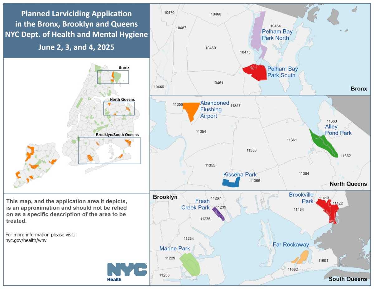 In Northern Queens, the treatment will focus on marshy and wetland areas known for producing high mosquito activity during the warmer months, particularly around zip codes 11356, 11362, 11692 and 11365. The city will use VectoBac® GS — a U.S. Environmental Protection Agency-approved larvicide that contains naturally occurring bacteria — to kill mosquito larvae before they can mature into adults.