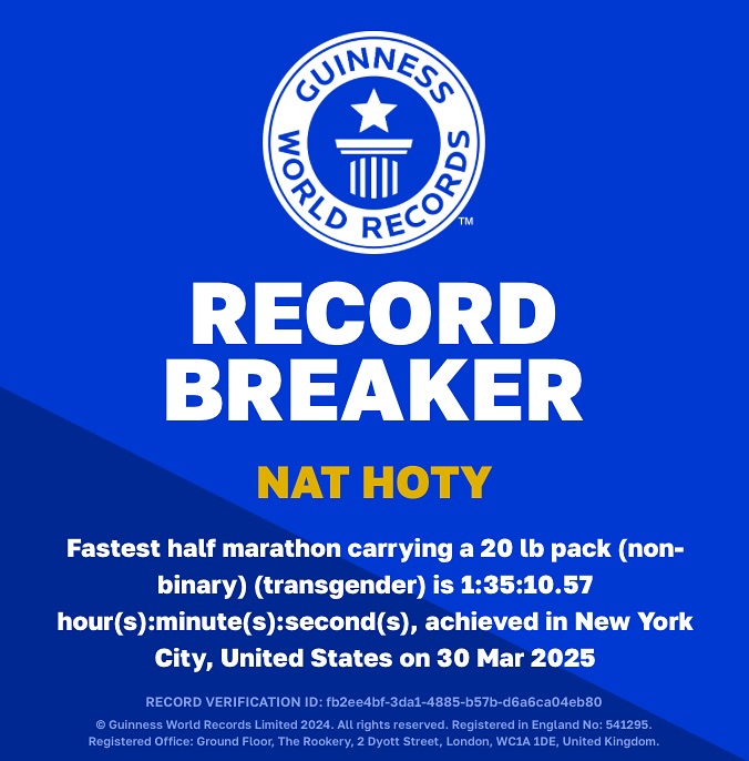 On Sunday, March 30, Nat Hoty, a nonbinary actor, dancer and fitness coach from Kent, Ohio, broke the Guinness World Record (GWR) for fastest half-marathon carrying a 20 lb. vest by a transgender/nonbinary athlete at the Queens Distance Runners (QDR) half marathon event of the Queens Marathon, the premier race event of Flushing Meadows-Corona Park.