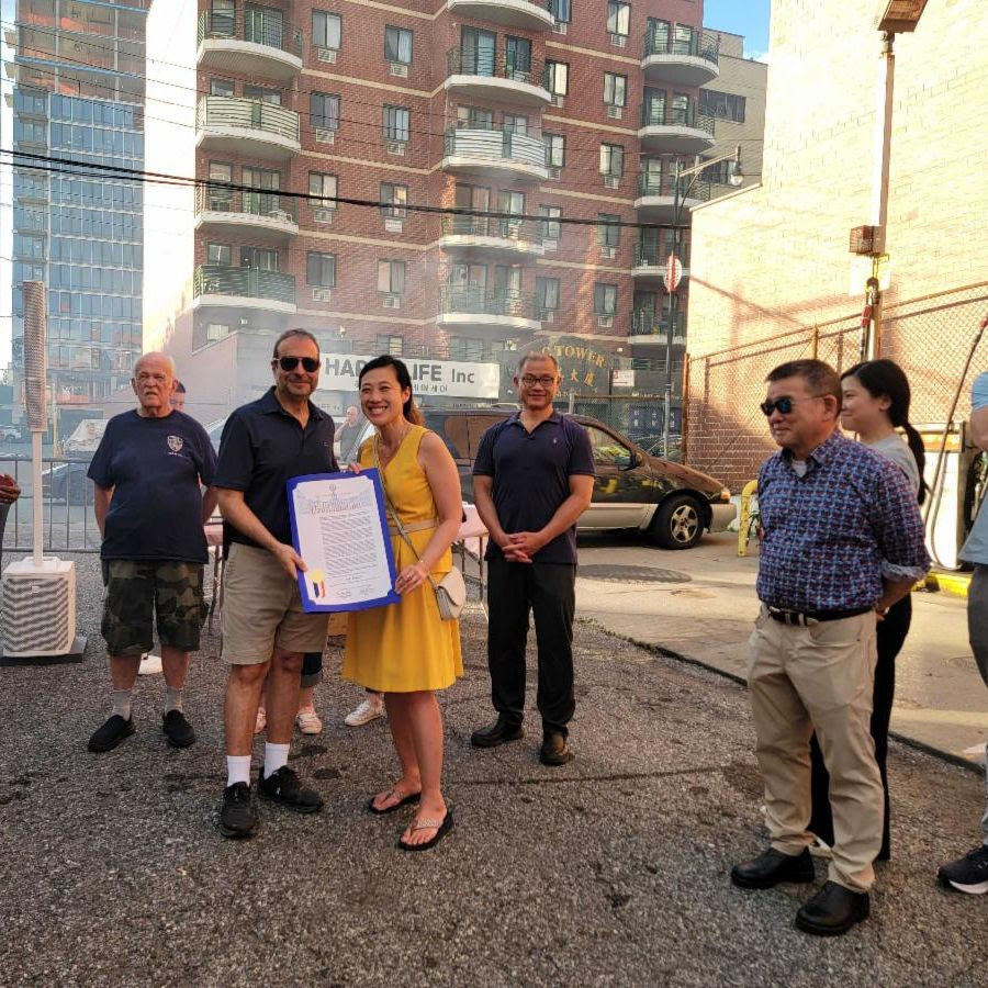 State Senator John Liu and Assembly Member Ed Braunstein also attended the event, which took place amid high temperatures and strong community turnout. The barbecue was sponsored by the Sky View Parc Homeowners Association.