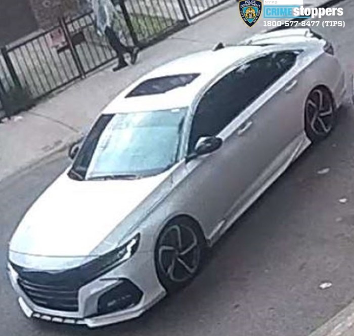 The suspects drove off in this white car with two stolen French Bulldogs. NYPD