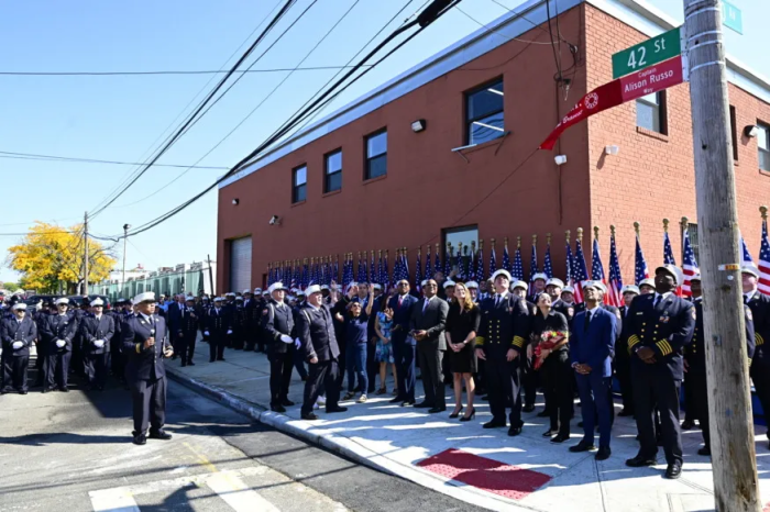 The ranks moved outside Station 49, where 42nd Street between 20th Avenue and 19th Avenue was co-named “Captain Alison Russo Way” on a fire engine red street sign. Photo courtesy of FDNY
