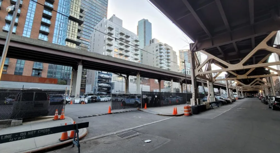 The new park will convert a 17,000-square-foot lot on Dutch Kills Street—currently used by a DOT contractor for vehicle parking—and an adjacent 33,000-square-foot NYPD School Safety parking lot. While the DOT lot sits entirely beneath the bridge structure, the NYPD lot is mostly uncovered, offering a rare opportunity for sunlight and plantings in an otherwise shaded corridor.