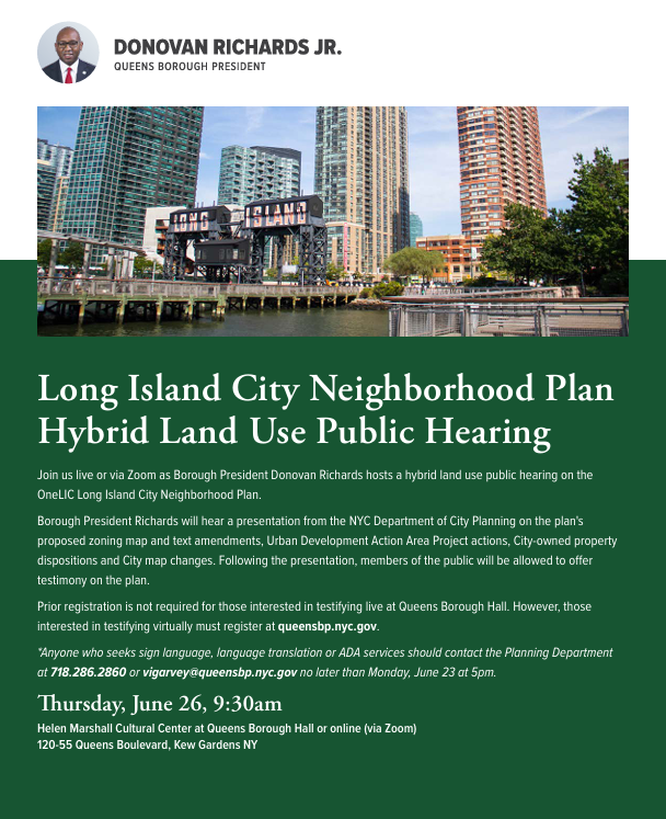 Borough President Richards will host a Land Use Public Hearing on the OneLIC proposal on Thursday, June 26.