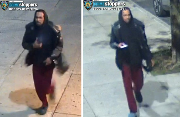 The NYPD released surveillance images of the suspect and described him as having a dark complexion with black hair, beard, and mustache. He wore a black winter jacket with a fur-lined hood over a black hooded sweatshirt, maroon pants, and blue Crocs.
