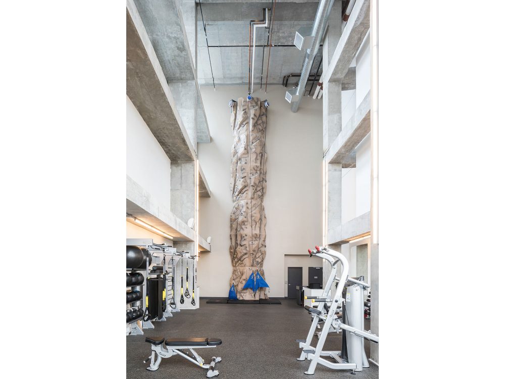 The fitness center also features a professional rock-climbing wall. Rendering courtesy of SLCE Architects.