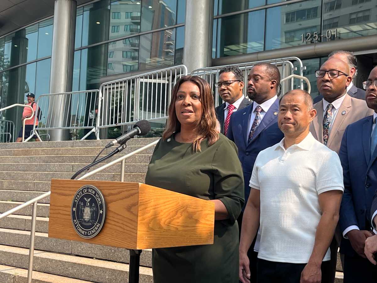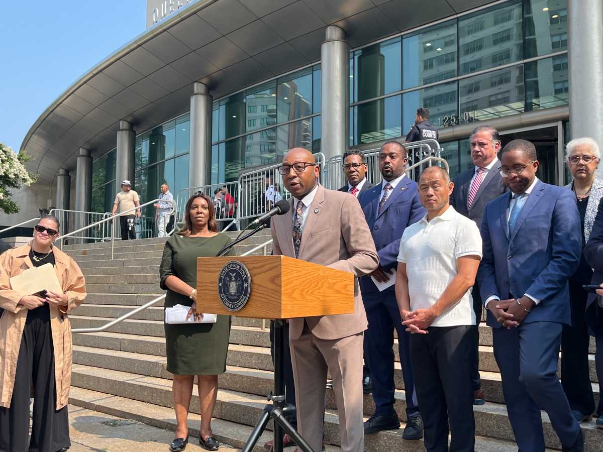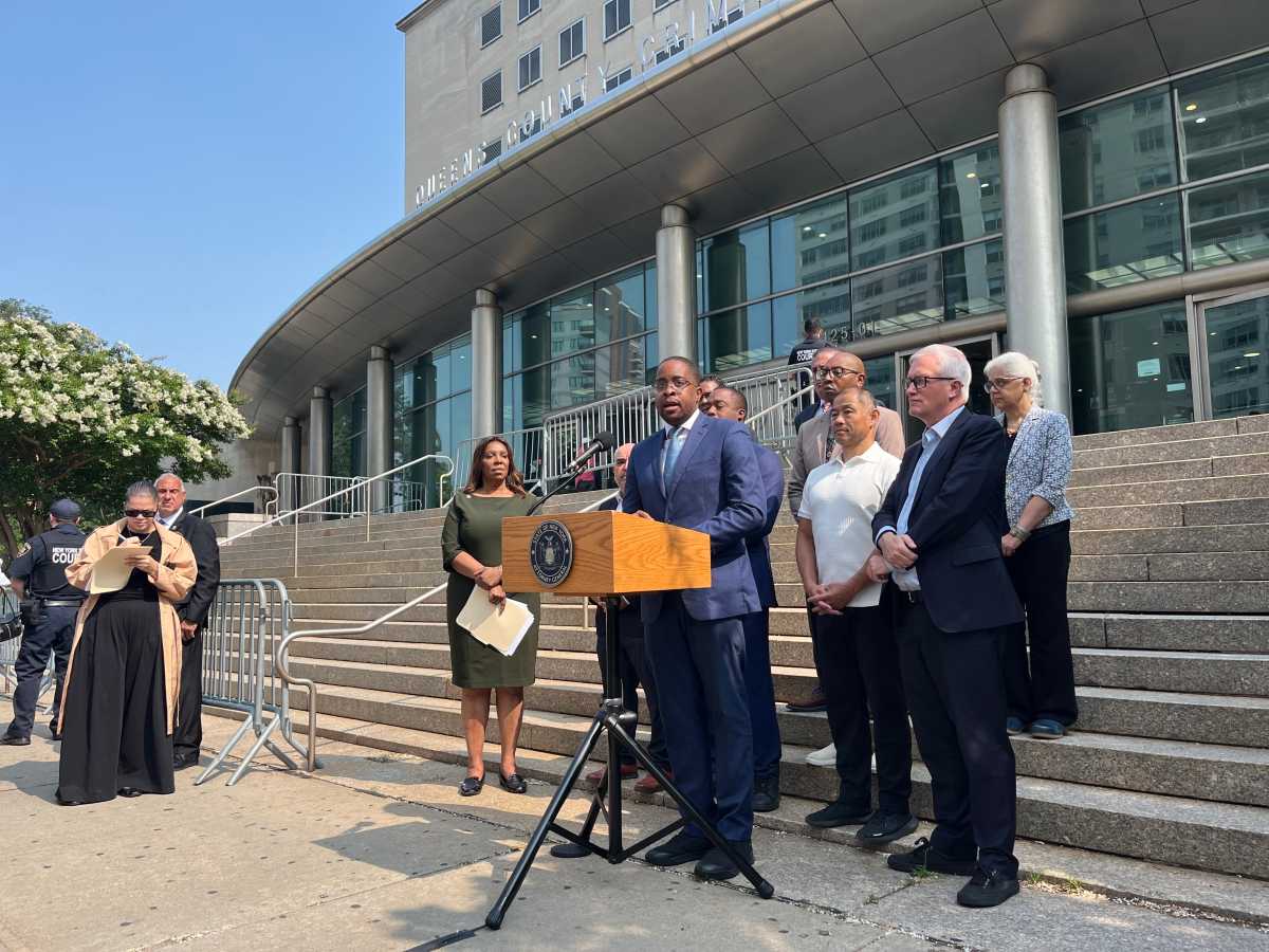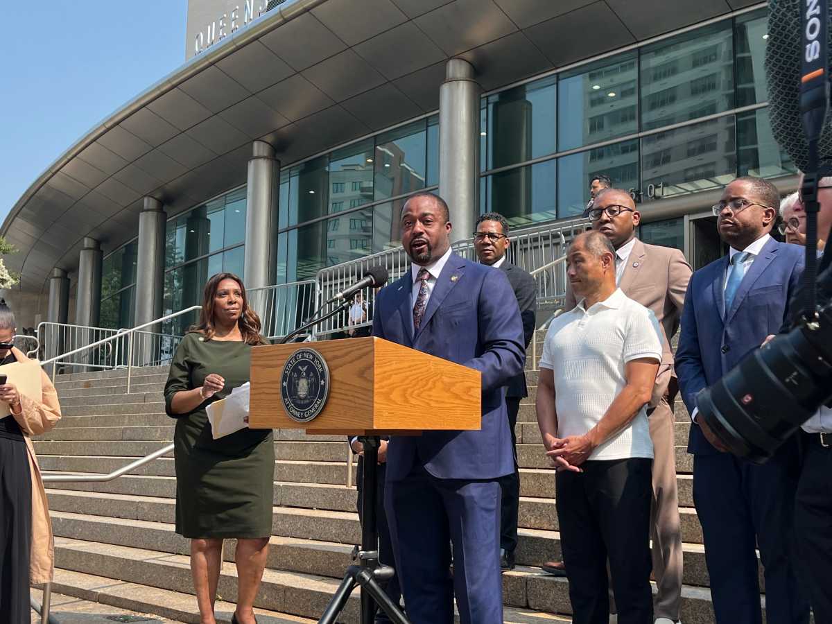 James announced that two New York City residents have been charged with multiple felonies in an alleged scheme to defraud an elderly Kew Gardens Hills resident of her home at a press conference on the steps of Queens County Criminal Court on Thursday, Aug. 7. This case is the first of its kind brought under New York’s new deed theft law, which went into effect July 19, 2024.