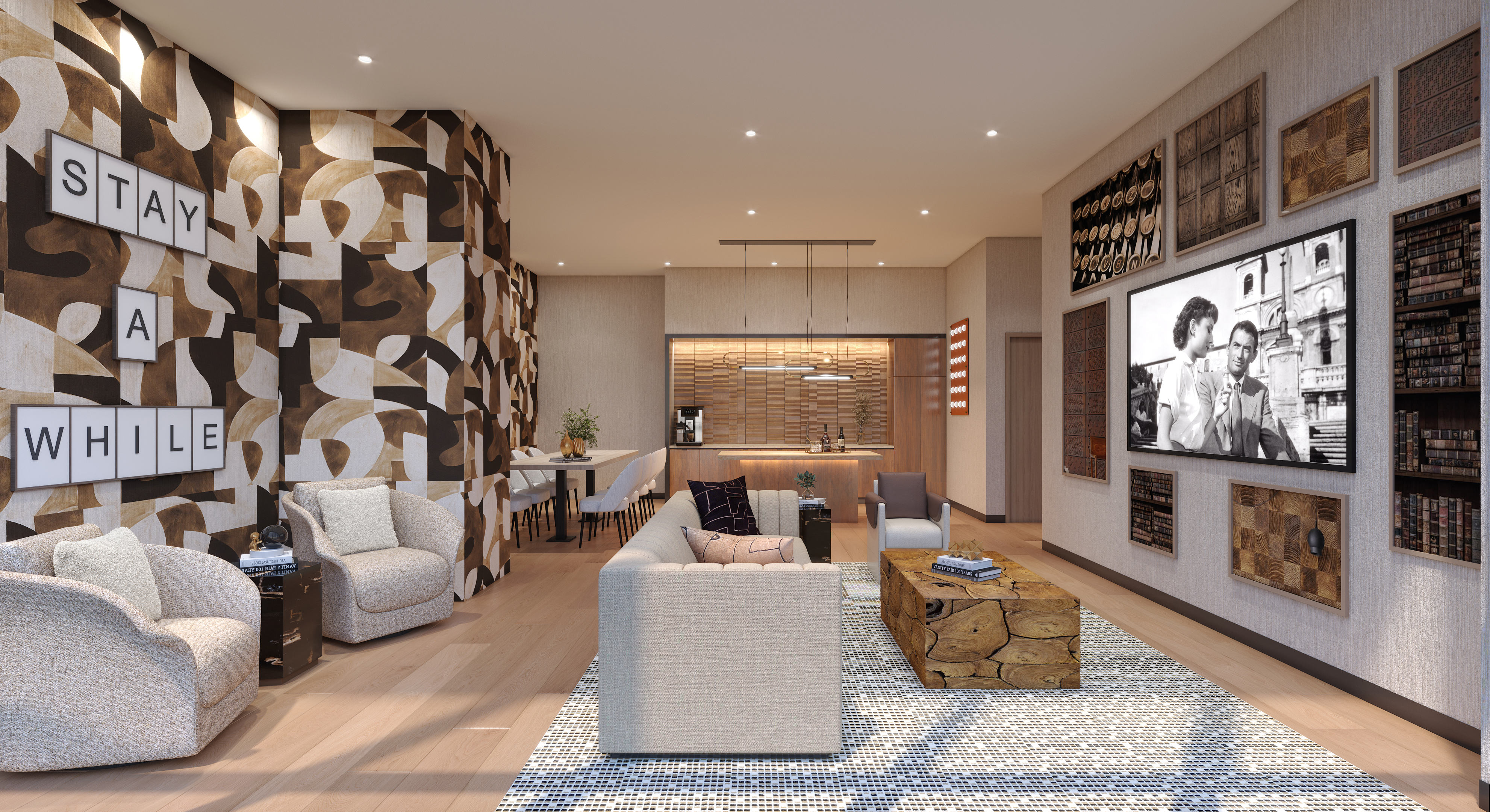 Among the amenities available for residents at The Bold is a golf simulator room with ample seating meant to give the feel of a clubhouse, a gym that features a rock-climbing wall and top-of-the-line equipment, and a modern lounge with multiple televisions. There is also a media room that features couches and a large television. A party room will also be available for private reservations, offering a space for dining and lounging and featuring a kitchen/bar area and curated art and books.
