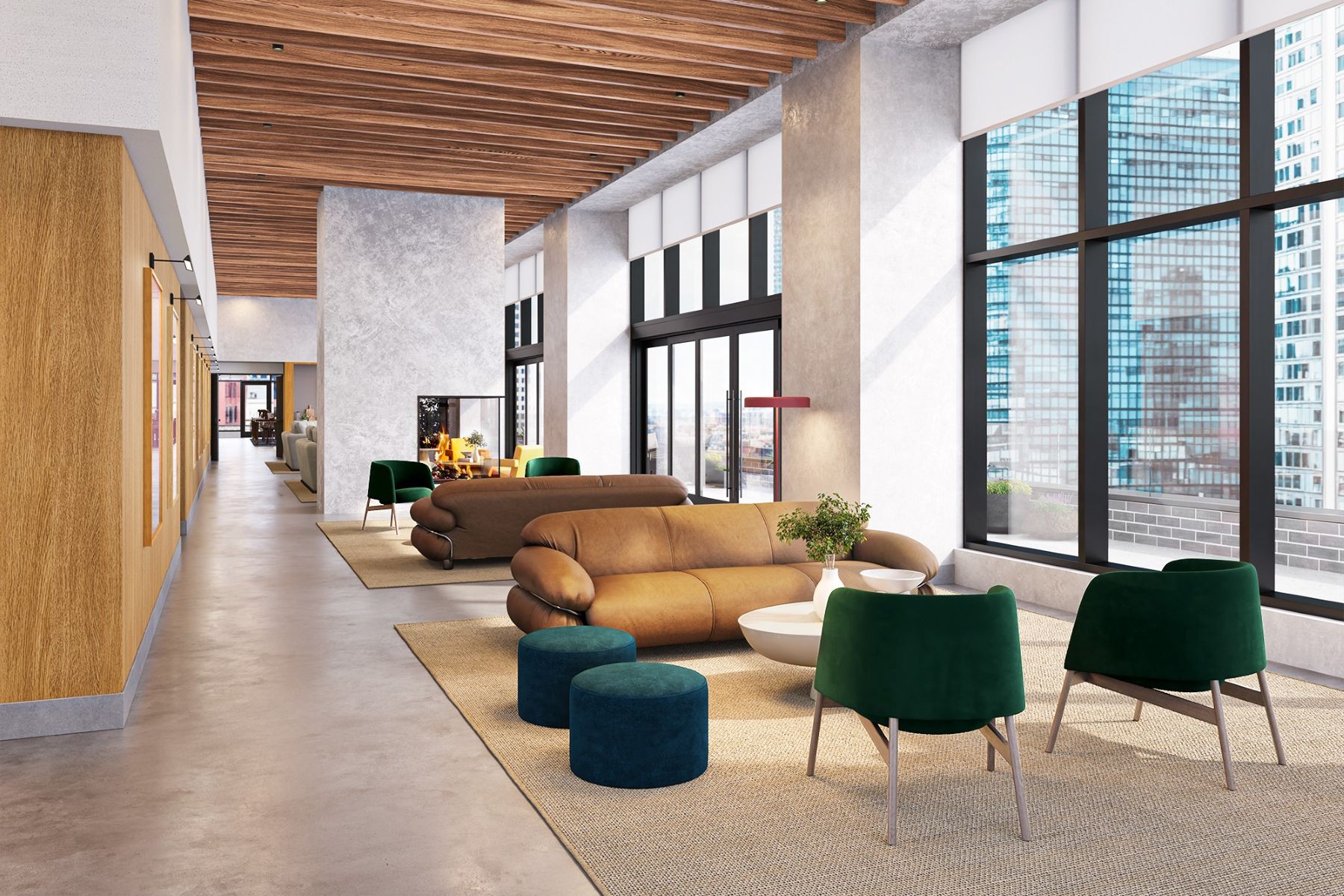 The lounge and co-working space. Rendering courtesy of Grubb Properties.
